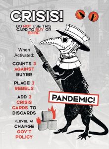 The player who caused the last Crisis draws a card at random from the Panic! deck. This represents an opportunity for the Billionaires to work together to undermine the revolution, so show it to everyone.