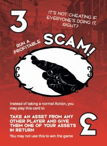 You can discard the Scam card to take an asset from another player and give them an asset of your choice in return. However, you cannot use power this to get the fifth Asset you need and win the game.