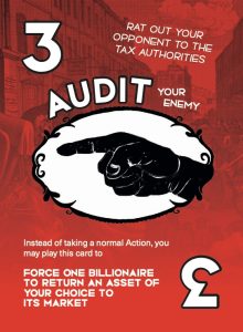 When a player sets the “Billionaire Audited” policy, they may pick one Asset held by another player and force that player to return that Asset it to its market, just like the Audit card.