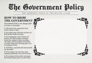 The player who caused the last crisis now slowly counts to three, at which point any player may (but does not have to) hold up their Bribe envelope to make a bet.