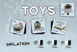In Billionaires & Guillotine, your objective is to collect five Assets that match the categories on your Billionaire sheet. There are multiple Assets in each of the five categories: Toys, Influence, Legacy, Power, and Vanity.