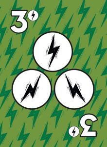 For example, let’s say I’m the Tech Overlord and want to Buy the Mercenary Army from the Power Market. I play two cards from my hand, a 1 and a 2, for a total of 3. I now reveal the cards at the market: a 2 and a 3. But because the 2 is in the green lightening-bolt suit, it counts towards my points. So now my 5 points beat the 3 in the market, and I win.