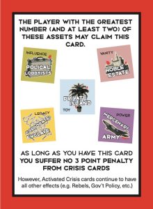 When the “Tax Tyranny” policy is set, the two richest players (those who have the most Assets they need to win) both must either discard cards from their hand worth a total of at least three points, or return an Asset of their choice to its Market.
