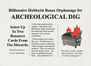 When a player sets the “Archeological Dig” policy, they may take any two cards from the Discard pile into their hand, then immediately discard down to two cards (unless they are the Banker, in which case they can have three cards).