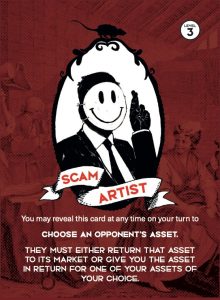 You can Reveal the Scam Artist card to choose an Asset owned by another player. That player must either