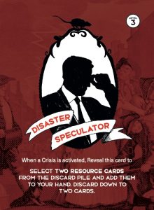 If you’re the Disaster Speculator, you can Reveal your card after a Crisis is resolved to take any two cards from the Discard pile to your hand, then discard so you only have two cards left in your hand.