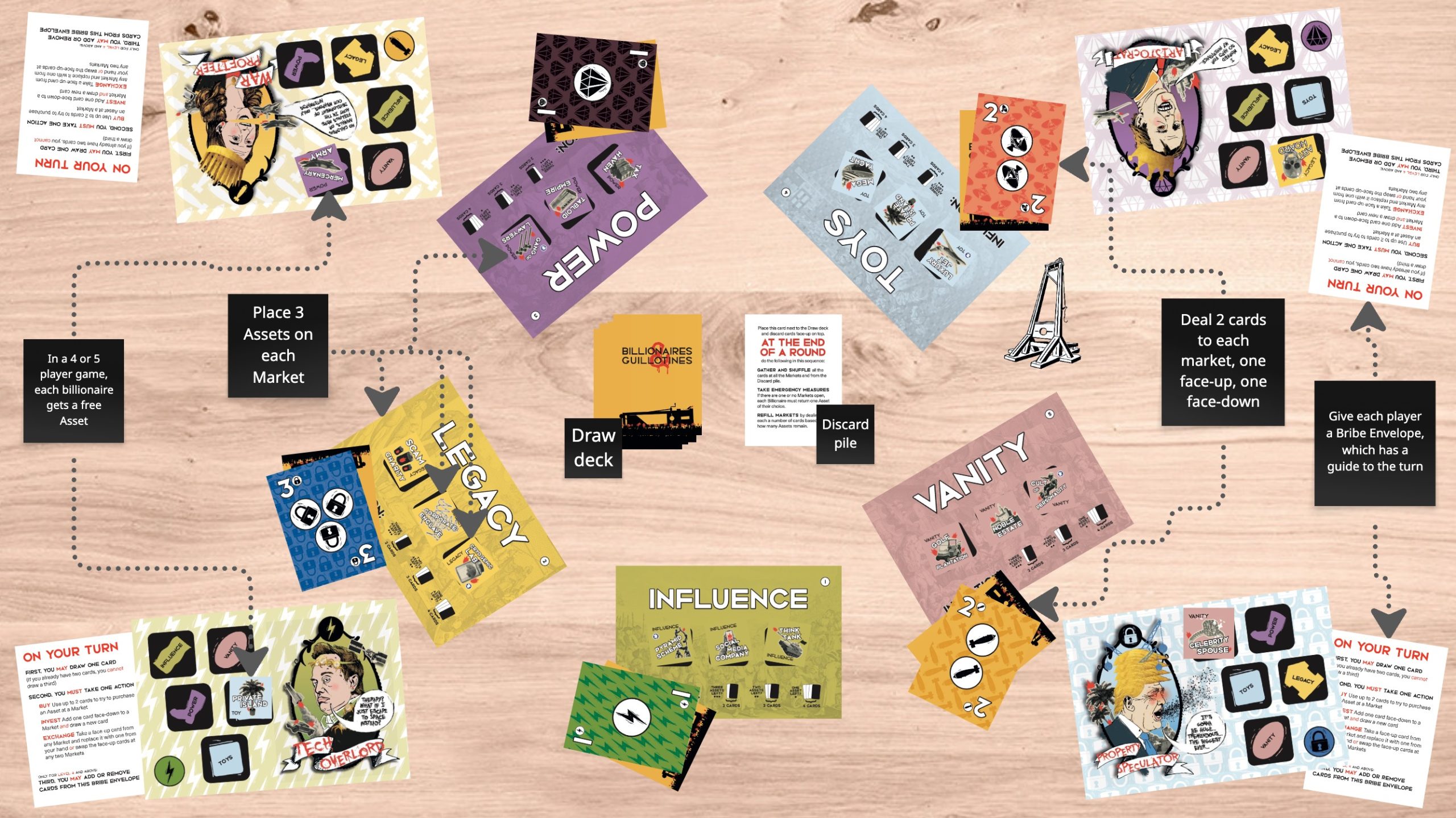 First thing’s first: each player selects one of the five Billionaires sheets: the Tech Overlord, the Property Speculator, the Aristocrat, the Media Baron, and the War Profiteer.