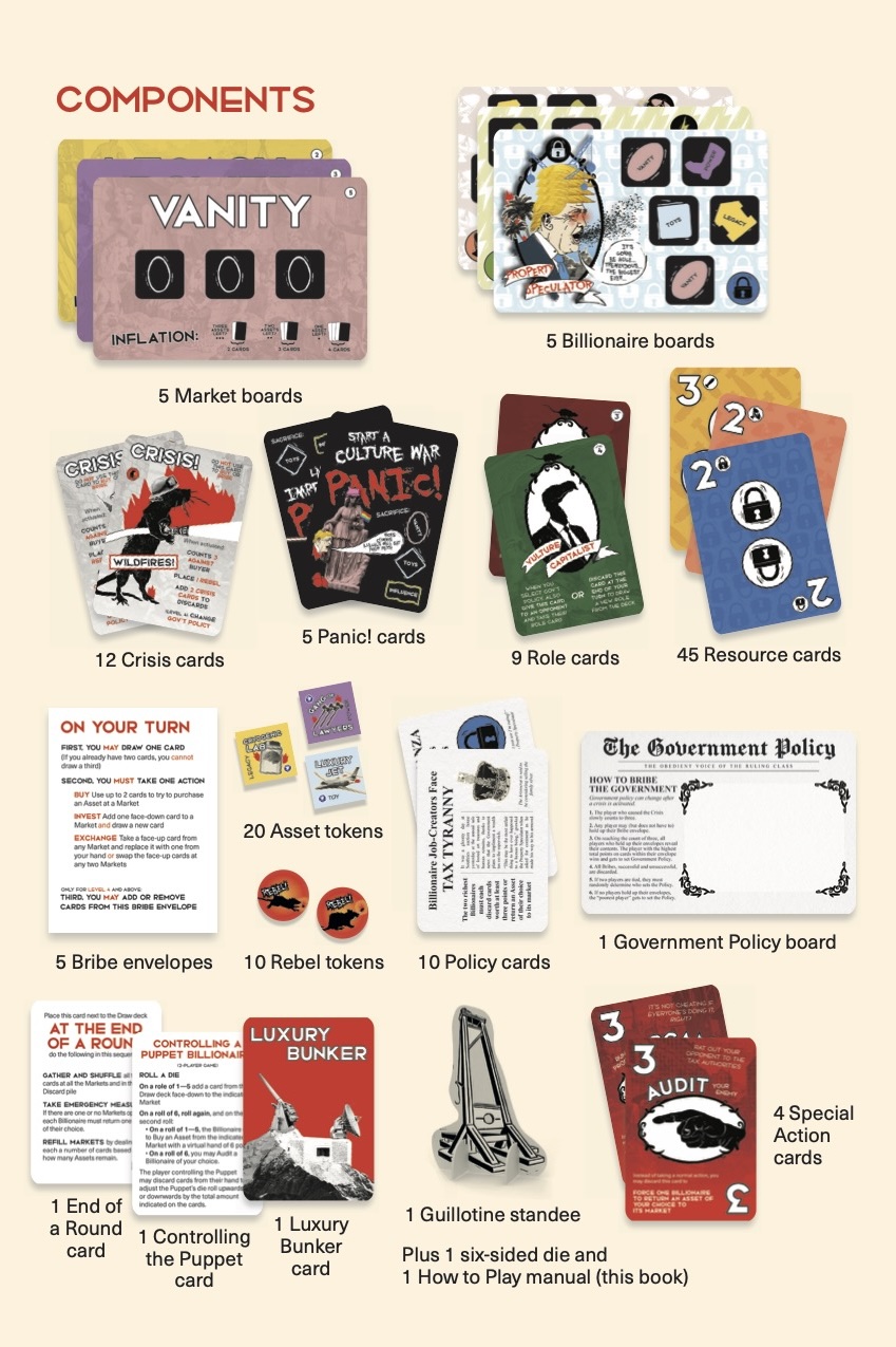 Will you play the media baron or the property speculator? The aristocrat or the tech overlord? Whoever you play, the aim is to acquire five extravagant assets prized by the super-rich (a mega yacht, a celebrity spouse, art masterpieces and more!) and prevent your opponents from achieving their dreams.