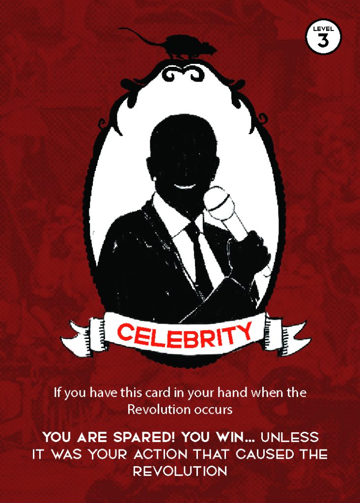 Can’t I just run away to my disaster bunker? Yes, of course! In the third level of Billionaires & Guillotines! Additionally, each billionaire will get a special secret role that offers special powers. Maybe you’ll be the banker who gets to cheat, the gangster who gets to steal, or the celebrity who is so popular they win when all their competitors succumb to the revolution.